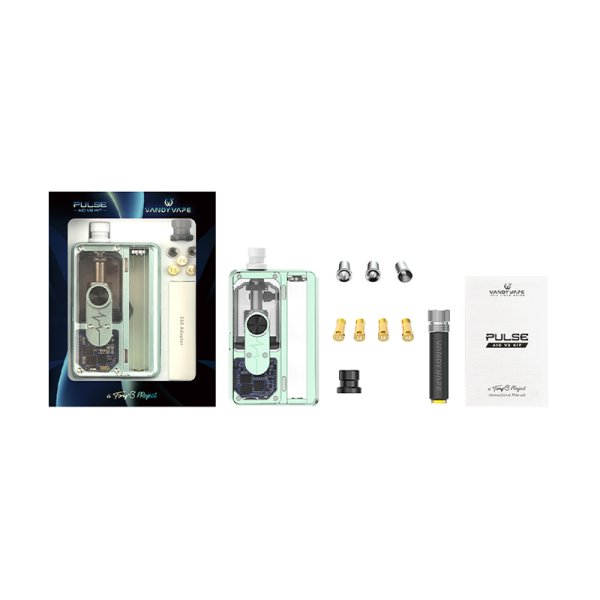 The new Pulse AIO kit in its V2 version, a model of elegance and robustness, compatible with all boro tanks.Single coil deck.Works with 18650 battery (not included).Power adjustable from 5 to 80 watts.Pulse RBA Boro tank with a capacity of 6 ml filling through the front.Airflow honeycomb adjustable with 4 pin : 1.5, 2.0, 3.0, 4.0 mm.2 Drip Tip (RDL and DTL) coupled with 3 pin allow maximum customization of the draw run.Chipset IP67 PCBA Waterproof.Clear and readable 0.42" OLED display.The Pulse V2 can be switched to a standard box thanks to the included 510 adapter.